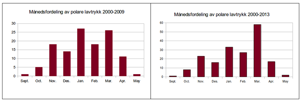 Figuren til venstre viser typiske månedsfordelingen av polare lavtrykk, her representert ved perioden fra 2000 til 2009. Til høyre ser vi månedsfordelingen slik den ser ut etter at vi inkluderer de intense marsmånedene vi har hatt de siste årene.