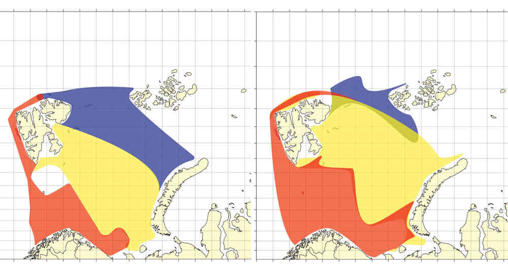 Bildet over til venstre viser fiskesamfunn i Barentshavet i 2004. Rødt er atlantiske fiskesamfunn, gult er sentrale og blått er arktiske fiskesamfunn. Til høyre ser vi fiskesamfunn i Barentshavet i 2012 På åtte år har de ulike fiskesamfunnene flytta seg nord- og østover. Illustrasjon: Havforskningsinstituttet.