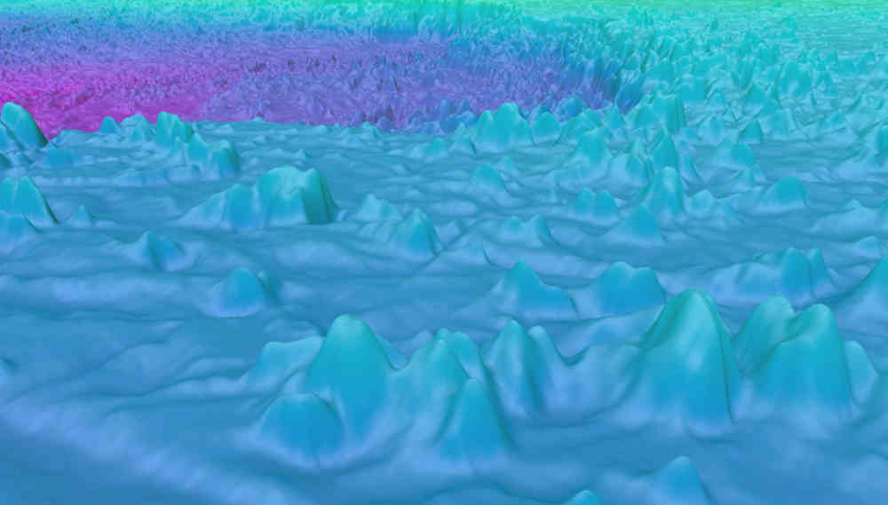 Skyggerelieff av havbunnen basert på terrengmodell med oppløsning 5 meter mellom dybdepunktene. Havbunnen er preget av forhøyninger, som kan være korallrev. De nærmeste toppene rager ca. 20 meter over havbunnen.