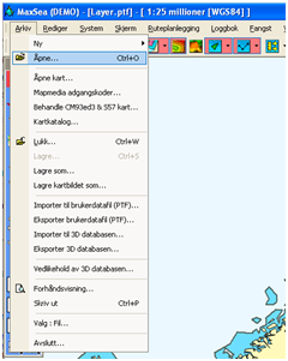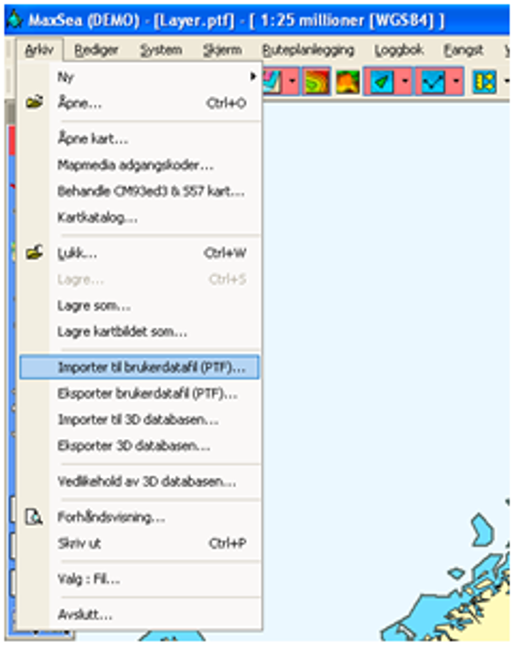 2. Trykk på menyen ”Arkiv” -> ”Importer til brukerdatafil (PTF)”: