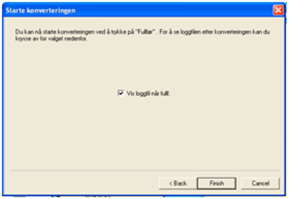 4. Sett kryss i feltet ”Vis loggfil når full.” og trykk på knappen ”Next >” / ”Neste”: