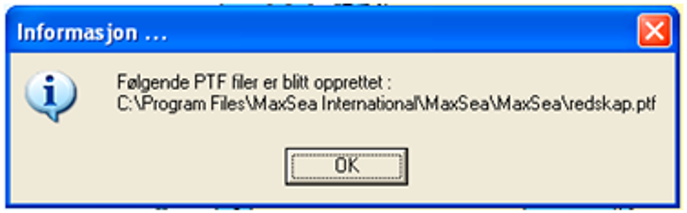 6. Når konverteringen er ferdig vil det komme frem en melding som forteller at det er opprettet en ny datafil. Vinduet viser også hvor på datamaskinen denne filen er lagt. (den blir lagt i programmappen til MaxSea). Det er viktig å merke seg denne adressen slik at du finner igjen den konverterte filen: