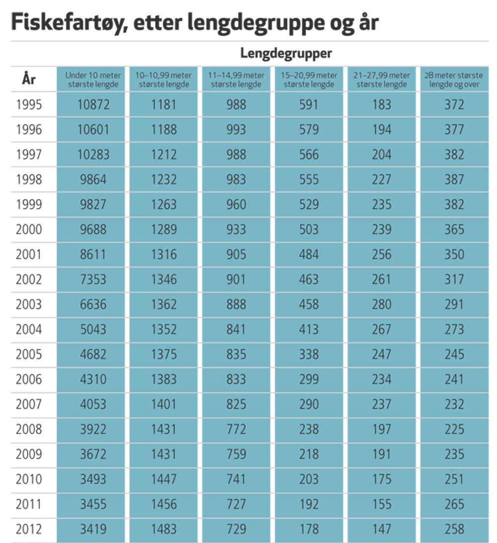 Det er blitt stadig færre fartøy i kystfiskeflåten. Det gjelder særlig de minste båtene under 10 meters lengde. Fra å være 10 872 båter i 1995, har tallet sunket til 3 419 i 2012. Reduksjonen har også vært betydelig for fartøy i størrelse 15 - 20,99 meters lengde. Reduksjon av fiskefartøy i kystfiskeflåten var størst mellom 2000 og 2004. Imidlertid har man de senere år sett en økning blant de største kystfartøyene.