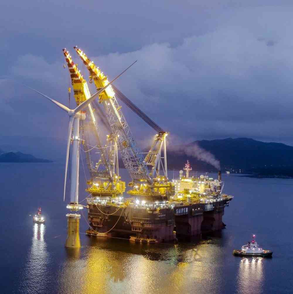 En Hywind-enhet fra Equinor, montert ved Stord, har her en høyde på 83 meter og en vekt på om lag 670 tonn.