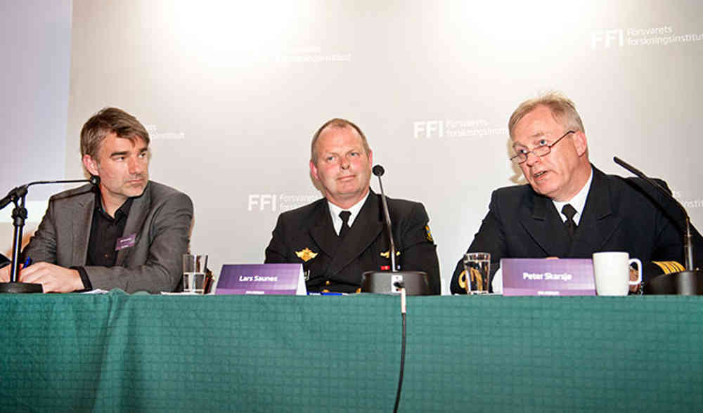 FFI-forsker Atle Ommundsen, flaggkommandør og sjef Kystvakten Lars Saunes og kommandørkaptein FOH Peter Skarsjø i paneldebatt på FFI-forum om maritim overvåking. Foto: FFI.