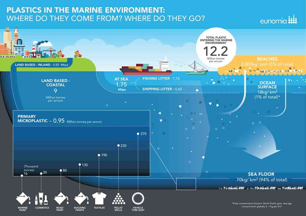 Ifylgje rapporten «Plastics in the Marine Environment» frå Eunomia, hamnar på verdsbasis: