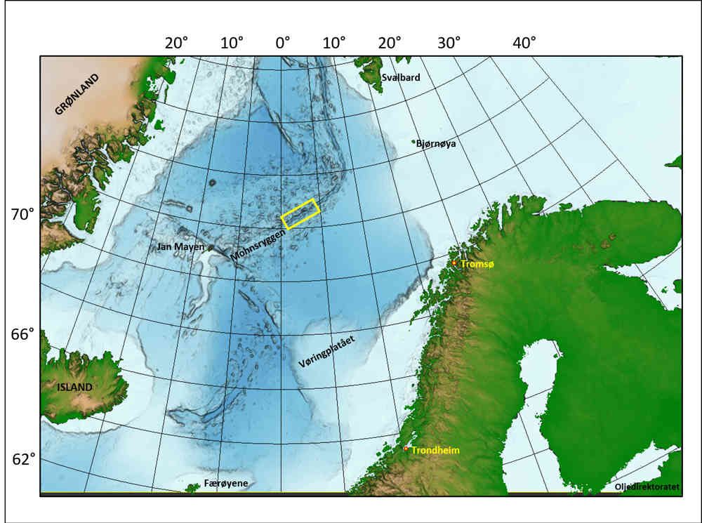 Toktet for å undersøke eventuelle forekomster av havbunnsmineraler foregår på Mohnsryggen, innenfor den gule boksen. Kart: Oljedirektoratet.