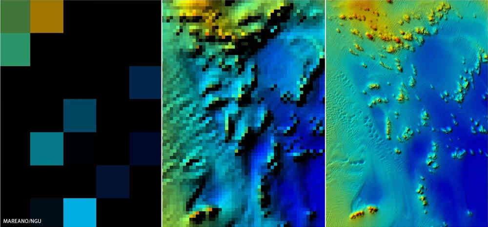 Figuren viser forskjellene mellom oppløsning på 500 x 500 meter (t.v.), 50 x 50 meter (i midten) og 5 x 5 meter (t.h.). Figuren er fra Hola utenfor Vesterålen og man ser tydelig korallrev og sandbølger i bildet til høyre. Illustrasjon: NGU, basert på dybdedata fra Forsvarets forskningsinstitutt.