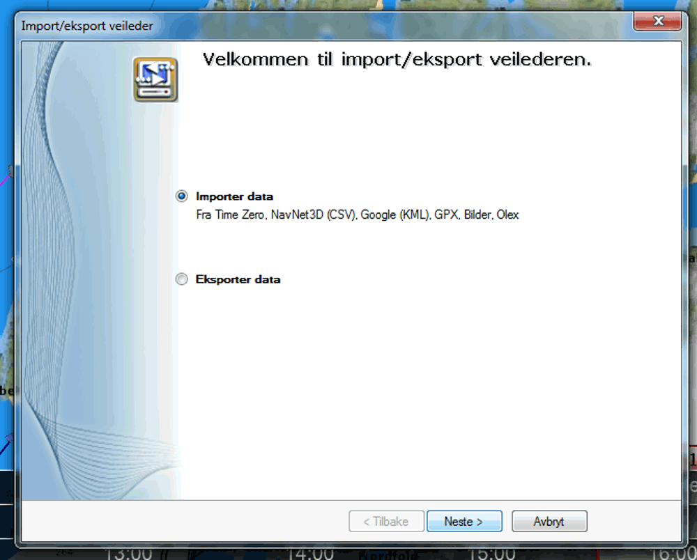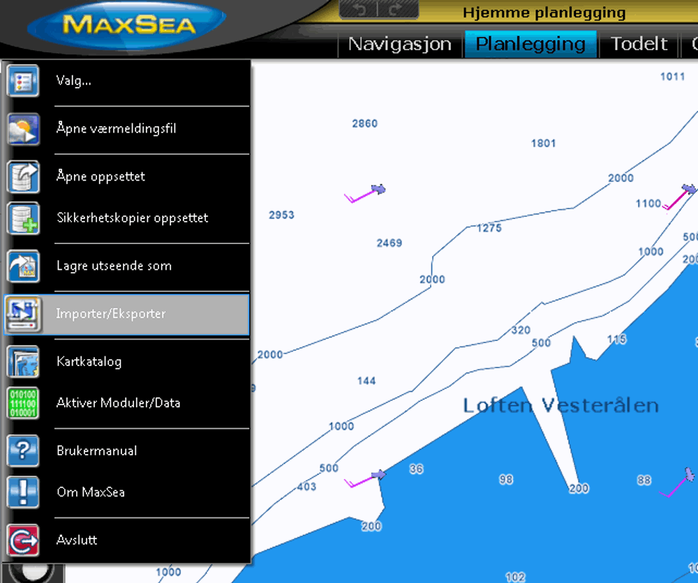 1. Trykk på MaxSea-knappen og velg Importer/Eksporter fra menyen.