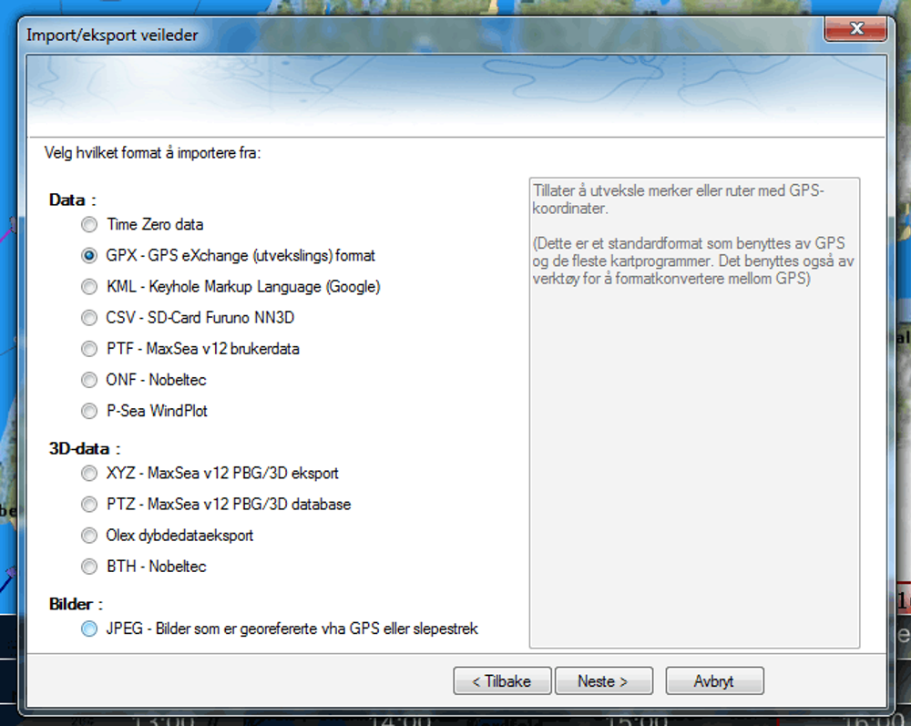 3. Velg formatet GPX – GPS eXchange (utvekslings)format og trykk Neste.