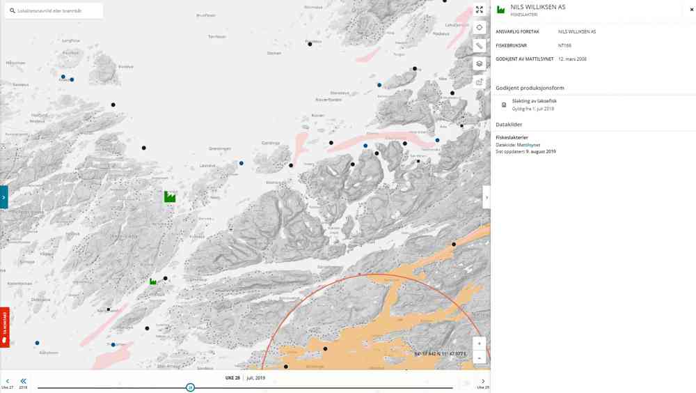 - Første versjon av slakterier vises nå i kart som grønne fabrikk-symboler og er klikkbare for å se mer detaljer. Slakterisymbolene blir mer synlige etter hvert som du zoomer inn. Vi viser ansvarlig foretak, navn, fiskebruksnr., posisjon, hva slakteriet er godkjent for og godkjent/gyldig datoer.