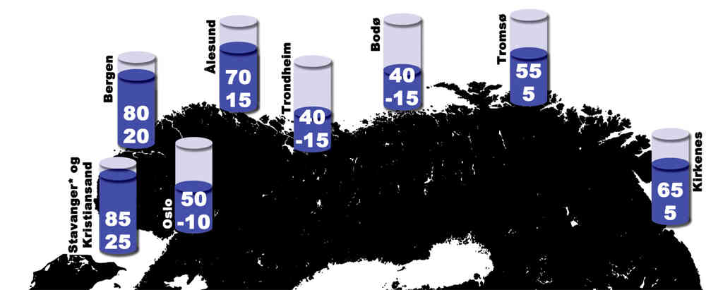The estimated probable change in the water level in a 100-year perspective. Stavanger and Kristiansand will likely experience an increase in the water level of between 24 and 85 cm in the next 100 years. The change in Trondheim will be between a 40 cm increase and a 15 cm decrease in the water level. Ill: Drange, Nilsen, Richter and Nesje (2012).